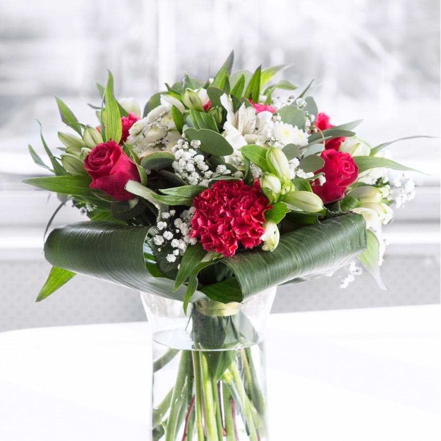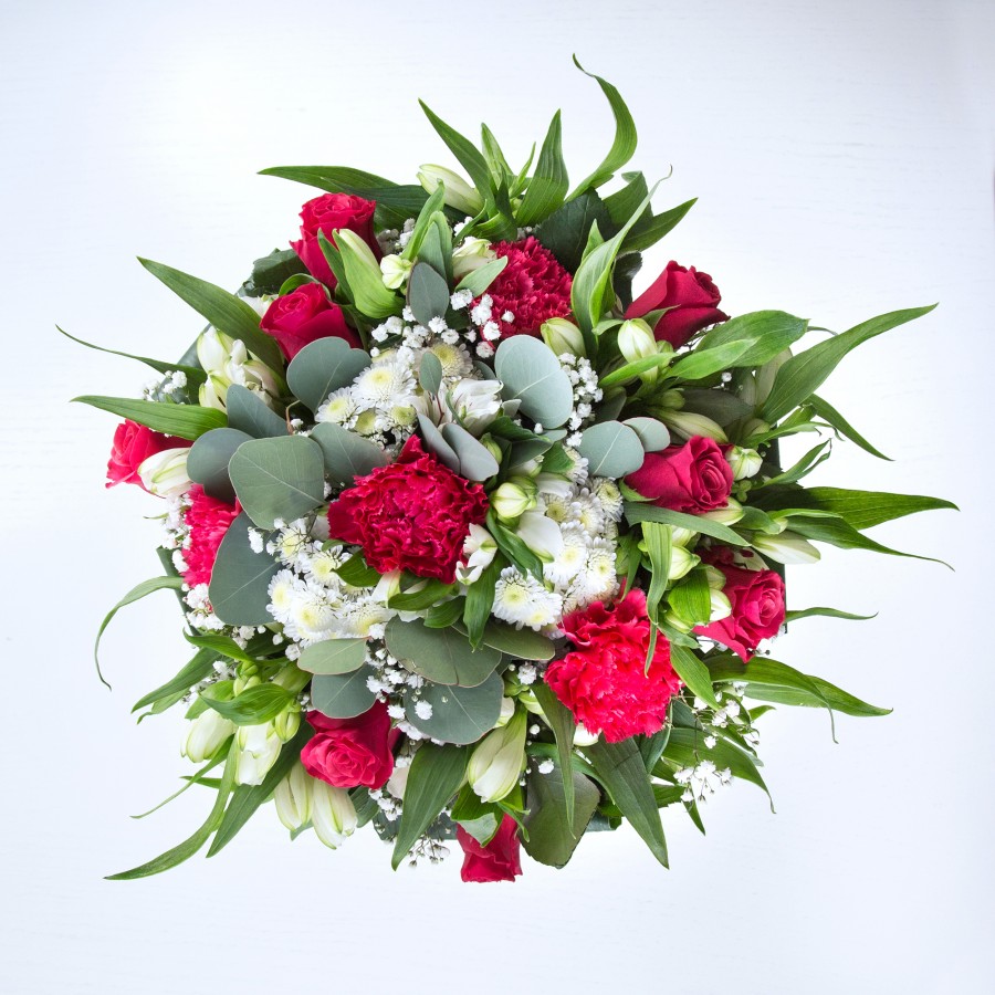 Discover the timeless beauty of our exquisite flower arrangement. This bouquet features luxurious red roses and carnations seamlessly blended with sweet white chrysanthemums and gypsophila, accented by white alstroemeria and aspidistra leaves for a sophisticated touch.