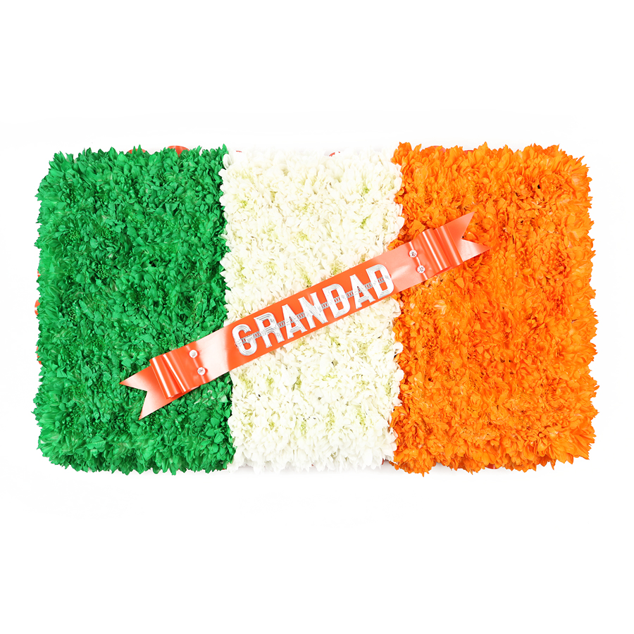 Express your sincere condolences with our Irish Flag Tribute Bouquet, a stunning arrangement crafted with green, white, and orange chrysanthemums. This elegant bouquet embodies the colors of the Irish flag, symbolizing peace and unity, making it a heartfelt gesture in times of remembrance.