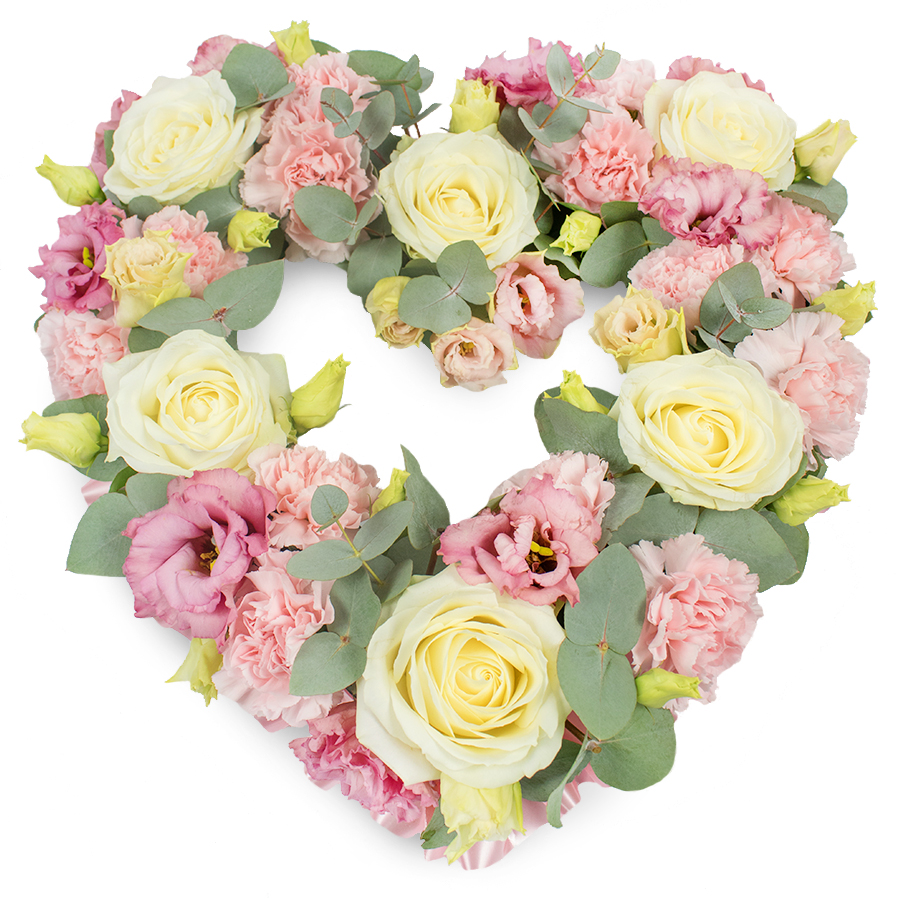 Present your heartfelt sentiments with our Stunning Open Heart Floral Arrangement. This exquisite bouquet combines white roses, pink carnations, and pink lisianthus, enhanced by green eucalyptus leaves. Each bloom is hand-selected to ensure superior freshness and lasting beauty.